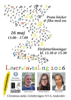 Nu är det dags för den årliga Litteraturrundan igen och i år är Boklarssons med på två evenemang. Torsdagen den 14 maj inviger vi Litteraturrundan på Trelleborgs museum och lördagen den 16 maj har vi för tredje året i rad Litteratursalong i Christinas ateljé i Norra Grönby där vi bjuder på författarläsningar för både gammal och ung, bokprat och fika.