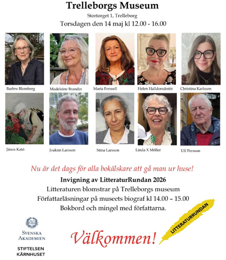 Nu är det dags för den årliga Litteraturrundan igen och i år är Boklarssons med på två evenemang. Torsdagen den 14 maj inviger vi Litteraturrundan på Trelleborgs museum och lördagen den 16 maj har vi för tredje året i rad Litteratursalong i Christinas ateljé i Norra Grönby där vi bjuder på författarläsningar för både gammal och ung, bokprat och fika.